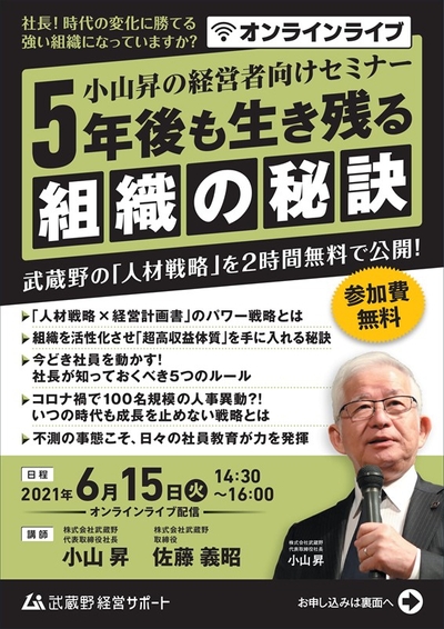 株式会社武蔵野(東京都小金井市、代表取締役社長:小山昇、以下武蔵野)は、6月15日14:30より、『5年後も生き残る組織の秘訣』と題しまして、経営者向け無料オンラインライブセミナーを開催することを決定いたしました。昨今の日本では、少子高齢化や増税、働き方改革、そして新型コロナウィルス(Covid-19)など信じられないほど様々な要因で経済が変化し続けています。小山は毎年、5年で売上2倍を達成するための計画を立てています。そんな、常に5年先を見つめる小山の人材戦略が、皆さまの経営に活かされることとなれば幸いです。