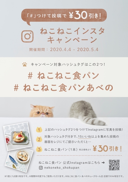 ご自身のインスタグラムに下記の2つのハッシュタグを付けて「ねこねこ食パン」を投稿していただき、「♥15いいね」をゲットすると、ねこねこ食パン1斤が30円引き!
