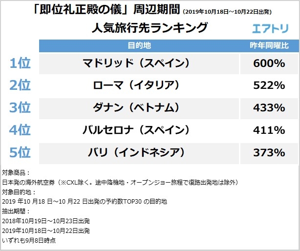 今年だけの祝日「即位礼正殿の儀」の影響で 海外航空券の予約数が昨年対比177%に 急上昇ランキングでは王室のある「スペイン」が2都市ランクイン! ~エアトリが「即位礼正殿の儀」周辺期間の航空券予約数を調査~