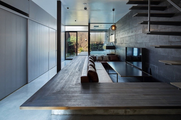 黒い板の間に、窓の外の庭が反射して神秘的な世界を京町家で体験出来る宿。