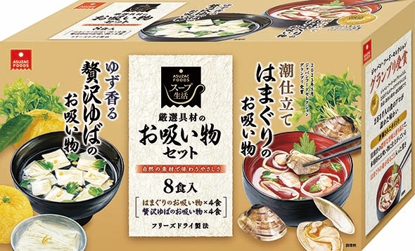 フリーズドライ・エアードライなど乾燥食品の開発・製造を手掛けるアスザックフーズ株式会社(代表取締役:久保正直、本社:長野県須坂市)は、累計7,800万食販売※1の「スープ生活」シリーズより、厳選具材を使用した2種のお吸い物(はまぐりのお吸い物、贅沢ゆばのお吸い物)をセットにした「厳選具材のお吸い物セット8食入り」を2024年11月1日(金)より発売しました。