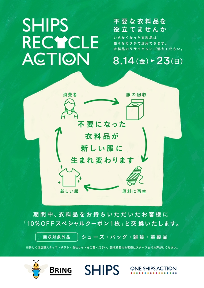 SHIPSは、日本環境設計株式会社が展開する、服の回収からリサイクル、再生素材を使った洋服の販売までを行うブランド「BRING™」に賛同し、SDGsの達成を考えたCSR活動と「サステナブルな社会実現」課題への取り組みの第一歩として、以下SHIPS(5店舗)にて、衣料品の回収を期間限定で実施。また、BRING™のマテリアルラインである「BRING Material™」の再生ポリエステルを使用したオリジナル商品の販売を開始いたします。