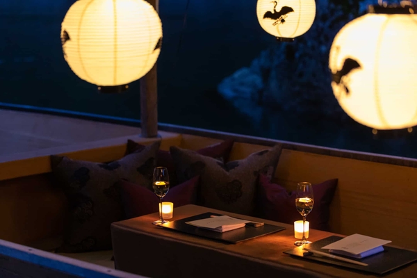 一般の鵜飼鑑賞船は乗り合いですが、本アクティビティの船は一日一組限定の貸し切り船です。クッションやキャンドルを設えたプライベートな空間でゆっくりと食事や鵜飼鑑賞を楽しむことができます。参加者は星のや京都の前から船に乗り、15分程かけて鵜飼が開催される下流へ向かいます。その間、船の上で行われるのは三味線の生演奏です。日中は観光客で賑わう大堰川ですが、夜になると静かになり、三味線の音色が暮れゆく奥嵐山の渓谷にこだまします。三味線を聞きながらの船遊びは星のや京都の鵜飼鑑賞船だけの特別な夏の過ごし方です。