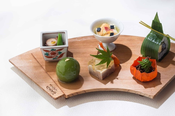 船の上では、京会席のはじめの2品「先附(さきづけ)」と「八寸」を楽しむことができます。先附「翡翠茄子(ひすいなす)の涼味仕立て」は、出汁をたっぷりと含ませた翡翠色の賀茂茄子で、川に映る青もみじを表現しています。パプリカのソルベと生姜のフォーム、雲丹を添えており、目でも舌でも涼を楽しめる一皿です。八寸には夏が旬の肉厚な青梅を銅鍋で柔らかく煮た「青梅の蜜煮」や、半夏生(はんげしょう)*2に豊作を願って食べる蛸を使った「蛸柔煮(たこやわらかに)」など、夏ならではの料理を提供します。鵜飼鑑賞後は「星のや京都ダイニング」に移り、鵜飼の余韻に浸りながら鱧の椀物や鮎の塩焼きなど京会席の続きの料理をゆっくりと楽しむことができます。