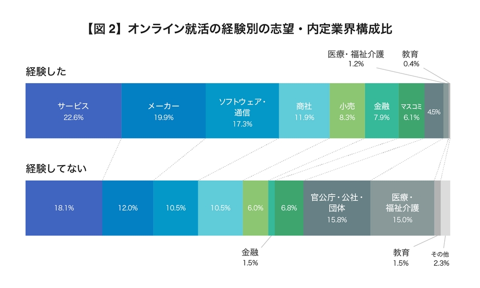 また、業界別のオンライン就活への対応状況を図るため、「経験した」「経験していない」とそれぞれ答えた人の志望・内定業界で抽出しました。就活生へのアンケートということもあり必ずしも業界の対応状況と合致するわけではありませんが、最も差があったのは、「医療・福祉・介護」の13.8ポイントで、「官公庁・公社・団体」が11.3ポイントと続きました。【図2】