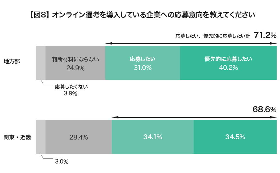 移動の制約を受けやすい地方部(関東・近畿以外)の就活生の回答を切り出してみると、よりその傾向が顕著になりました。都市圏の「優先的に応募したい」「応募したい」68.6%に対して、地方部は71.2%とより応募意向が高くなりました。