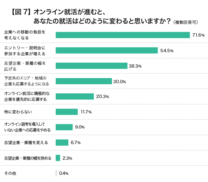 就活生にとって移動の制約がなくなることは、今後の就活のスタイルにも変化がありそうです。オンライン就活が進むと、あなたの就活はどのように変わると思いますか?と訊ねたところ、「予定外のエリア・地域の企業も応募するようになる」(30.0%)、「志望企業・業種の幅を広げる」(38.3%)と就活生は考えています。【図7】