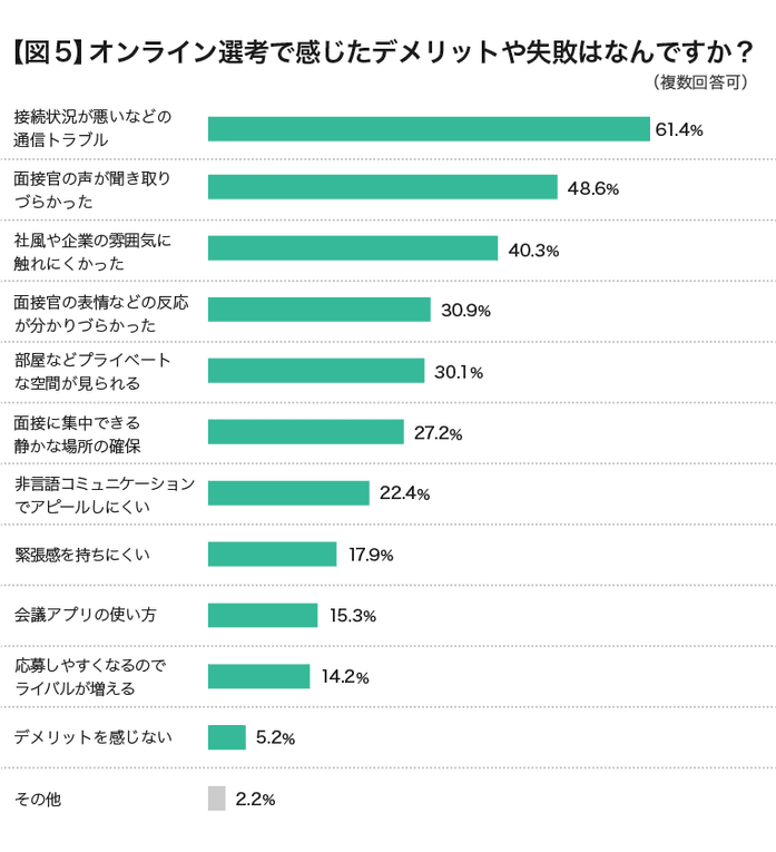 オンライン選考で感じたデメリットや失敗を聞いたところ、「接続状況が悪いなどの通信トラブル」(61.4%)がトップとなり、「面接官の声が聞き取りづらかった」(48.6%)が続きました。【図5】