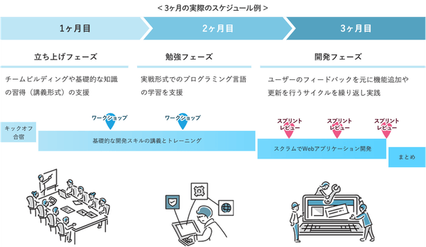 内製化を進めていく上で必要なスキルの習得を伴走型実践的トレーニングとスペシャリストによる短期研修により実現します。