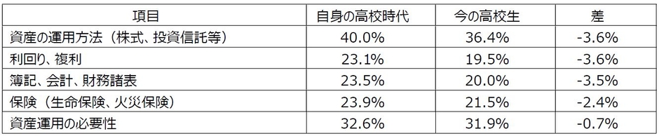 実際、「今の高校生に必要と思う金融教育」の回答でも、「資産の運用方法(株式、投資信託等)」は36.4%、「資産運用の必要性」は31.9%と、「保険(説明保険、火災保険等)」や「契約、クーリングオフ」、あるいは「iDeCo、NISA」といった項目と比べて高い数値になっています。したがって、高校生に「資産形成」の授業が不要と考えているわけではなく、むしろ多くの人がその必要性を感じていることが、この結果から窺えます。