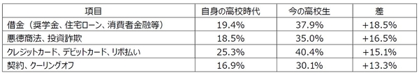 このうち、「自身が高校時代に受けたかった」と「今の高校生に必要と思う」で乖離が大きかった(つまり、自身の高校時代に学びたかったとはあまり思わないが、今の高校生には必要だと思っている)のは、以下の4項目です。
