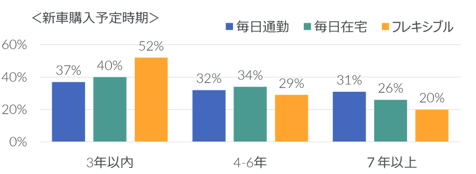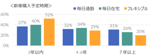 新型コロナウィルスの流行をきっかけにアメリカでもフレキシブルな勤務形態を選ぶ人が増えている。特に年齢が若く、高学歴で高収入のアメリカ人はリモートワークの選択肢が得られやすい傾向がある。新車購入意向者の中で、「在宅勤務」や「フレキシブルな勤務」が可能な人は、「毎日通勤」する人よりも、新車の購入サイクルが早い傾向があり、また電気自動車などの代替パワートレイン車への意向率も比較的高い傾向が見られた。