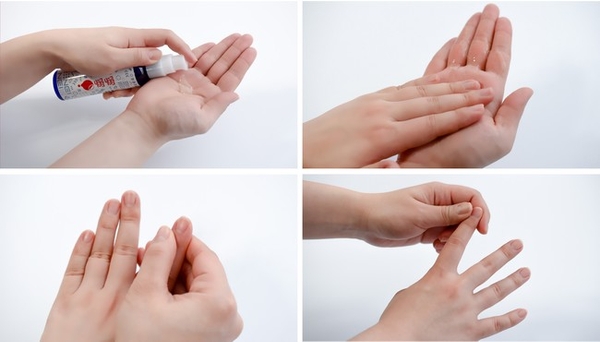 ① 手のひらに2プッシュ程度とり、手指全体や爪まで馴染ませます。