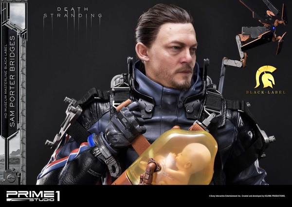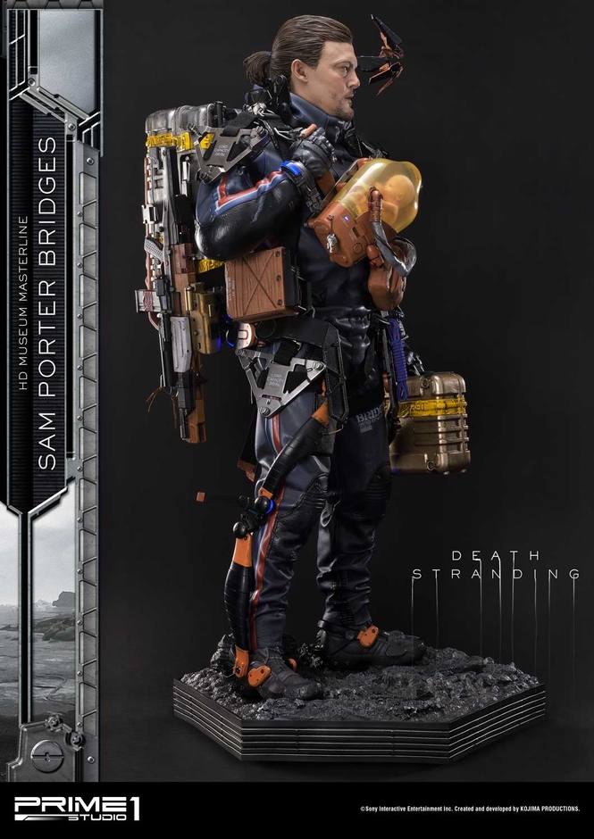 その主人公である『サム・ポーター・ブリッジズ』(演:ノーマン・リーダス)がHDミュージアムマスターラインで登場。1/2Scaleで再現された、凛々しい表情のサム自身とすべてに意味があるという装備類の数々、質感共に精密且つ忠実に立体化。全身の“運ぶ”そして“繋ぐ”為の装備はまるでゲームの本質を物語るよう。過酷な道程をサポートするための腰から脚部を強化補助する外骨格、“アクティブスケルトン”やBTを感知し位置を知らせる“オドラデク”、その根幹部分を担う“ブリッジベイビー”を保護する“BBポッド”など含め計8か所にはLEDライトアップ機能内蔵。