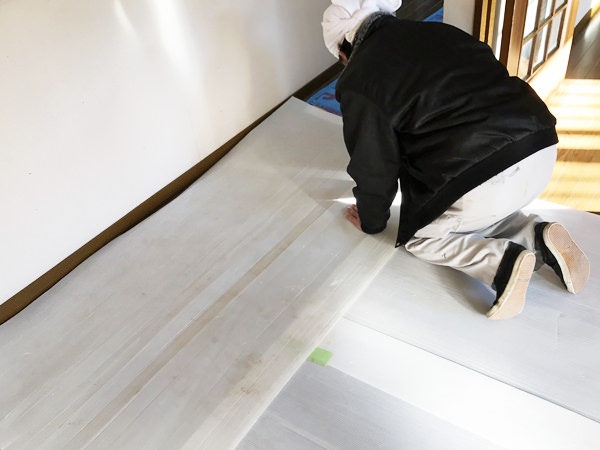 クロス張り替えで家具がありますと作業が行えない為、家具等を移動してキズなどが付かない様シートなどを被せていきます。