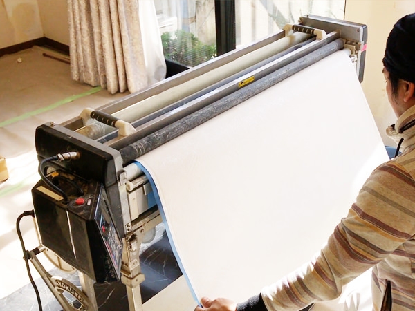 お選び頂いたクロスの裏面に、プロ用の専用機械で糊付けを行っていきます。
