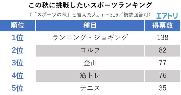 秋といえば「スポーツの秋」と答えた人に、秋にどんなスポーツに挑戦したいか聞いたところ、「ランニング・ジョギング」が最多回答の138票となりました。2位は82票獲得の「ゴルフ」、3位4位は僅差で「登山(77票)」、「筋トレ(76票)」と続きました。特に暑さの厳しかった今年は、夏の間に出来なかったことを、過ごしやすい秋にチャレンジしたいと考える人が多いようです。