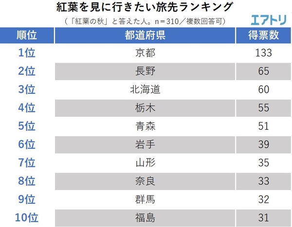 1位は133票を獲得の「京都」で2位に倍以上の差をつけての首位となりました。2位は千畳敷カールのある「長野(65票)」、3位は定山渓の「北海道(60票)」、4位は那須連山の「栃木(55票)」、5位は八甲田の「青森(51票)」と続き、国内屈指の紅葉スポットがあるエリアに得票が集中しました。