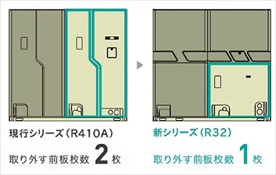 前板を上下2分割に見直し、施工やメンテナンスの際に取り外す必要のある前板の枚数を減らしました。室外ユニットの設置後に行う電源配線や冷媒配管の接続や、メンテナンス時の作業などに伴う作業工数を削減します。