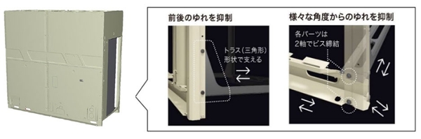 室外ユニットの多くが設置されるビルの屋上は、地震による揺れの影響も受けやすい場所です。本商品は、9階建ビル屋上程度の高さに設置して震度7相当の振動試験を行った後でも、空調機の運転に必要な圧縮機や電気部品、冷媒配管などが損傷せずに運転できる製品設計を採用しました。