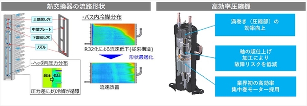・R32に適したマイクロチャネル熱交換器と圧縮機を開発し、業界トップクラスのAPF(※3)、COP(※4)を達成。R410Aを用いた従来機比でAPFと COPを約5%(※5※6)向上。