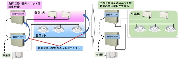 同じフロア内で負荷の偏りがある場合に高負荷の系統と低負荷の系統が連携し、目標能力を調整することで系統全体として消費電力を削減し、COPを約4%向上します。