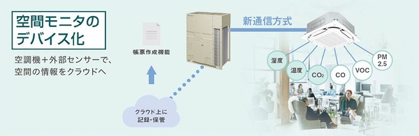 本商品では、室内ユニットに付属している温湿度センサーに加えて、室内のCO2やVOC、PM2.5などの空気質を検知する外部の環境センサーの接続も可能です。各種センサーで収集した空気質の情報を、室内ユニットを介してダイキンのクラウド型空調コントロールサービス『DK-CONNECT』に蓄積し、可視化や帳票化します。これにより大掛かりな計装工事をせず、より快適な空間づくりに貢献します。