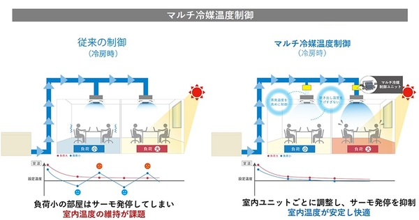・万一の冷媒漏えいの拡大を防止する「マルチ冷媒制御ユニット」が、室内ユニットごとの熱負荷に応じて冷媒温度を変化させ、快適性を向上し、消費電力量も約7%削減(※10)。