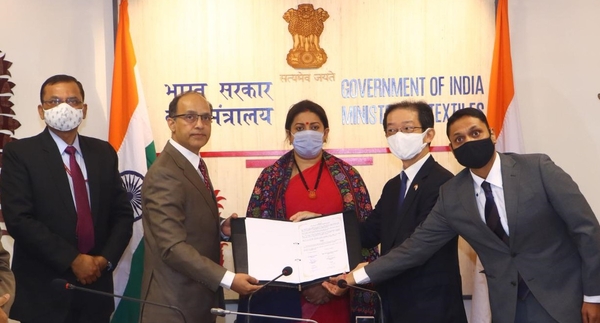 一般財団法人ニッセンケン品質評価センター(本部:東京都台東区蔵前 理事長:駒田展大)とインド繊維省テキスタイルコミティー(本部:ムンバイ市 代表:アジット・B・チャワン氏)は、2021年1月27日、繊維製品の品質向上や貿易促進等の相互協力に関する覚書に合意締結をしました。世界的なコロナ禍の中、ウェブ会議システムで日本とインドをつなぎ、日本側は経済産業省内で長坂康正経済産業副大臣が同席、またインド側はデリー繊維省内でスムリティ・ズビン・イラニ繊維大臣が同席のもと調印式を行いました。