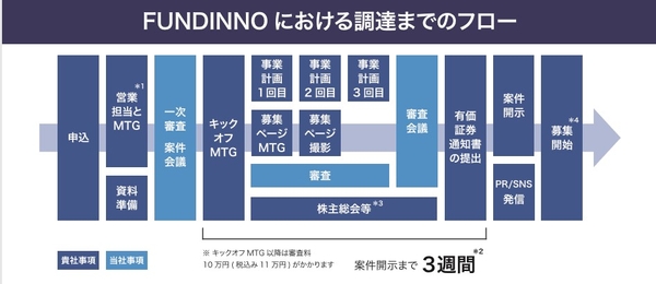 『FUNDINNO』で資金調達をスタートできるまで、キックオフミーティングから、最速3週間。さらに、資金調達に成功されてから3週間ほどでご入金することができます。