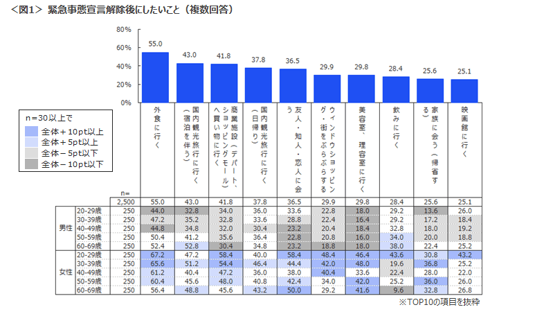 【緊急事態宣言が解除された後にしたいこと(複数回答)】のトップは「外食」。各項目をみると、「外食」「商業施設で買い物」「ウィンドウショッピング」は女性の中でも特に若い女性が高く、「美容室」は女性全体が高い傾向にあった。一方、「宿泊を伴う国内観光旅行」は60代男女と30代女性が高く、「飲みに行く」は男性全体と、20代女性が高い結果となった。全体として、その人たちが普段していたであろう項目が多く、自粛によって制限されていた普段の生活に戻りたいという人々の気持ちが伺える。<図1>