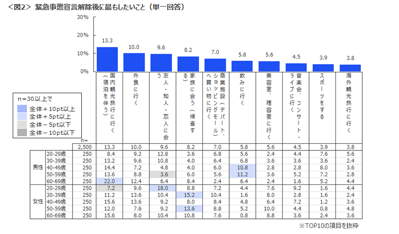 【最もしたいこと(単一回答)】としては、「宿泊を伴う国内旅行」がトップに。中でも特に、年齢が高い人ほど旅行に行きたい気持ちが高く、これから緊急事態宣言の解除が進むと、より旅行の需要が高まっていくと推測される。一方、20代女性では「友人・知人・恋人に会う」、30代、50代女性では「家族に会う」など、女性は比較的他者とのコミュニケーションに関する項目が高い傾向にある。 <図2>