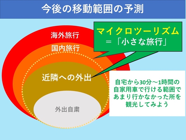 Withコロナ期における観光のあり方の前提は、「観光が感染拡大に貢献しないこと」であり、都道府県レベルでの感染対策や、さまざまな行政施策が行われている今般において、旅目的での遠出や、都道府県を跨ぐ長距離移動が発生することは得策ではないと考えます。マイクロツーリズムを通じて地域内観光を推進することで、ウイルスの拡散するリスクを軽減しながら観光需要を作っていきます。そして観光業が地域経済に貢献し、観光人材を確保できるよう、Withコロナ期収束後も見据えた観光のあり方を設計し、実践します。