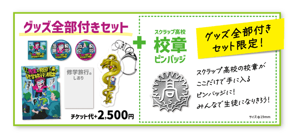『ときどき先生が見回りに来る修学旅行からの脱出』のオリジナルグッズ3種に加え、グッズ全部付きセットを購入いただいた方のみ手に入れられる「スクラップ高校校章ピンバッジ」が付いた特別なチケットです。すべてのチケットは、+ 2,500円(税込)でグッズ全部付きセットに変更可能です。