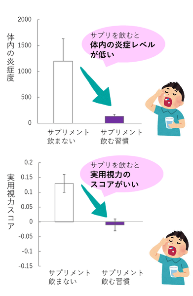 35歳以下の男女にて解析したところ、2ヵ月以上の抗酸化サプリメント(ルテイン、アントシアニン、マルチビタミン、ポリフェノールなど)の飲用習慣のあるグループと、サプリメント飲用習慣のないグループで比較したところ、飲用習慣のあるグループは飲用習慣のないグループに比べて、実用視力が良いということがわかりました。また、サプリメント飲用群は血中の炎症性マーカーの数値が低く、体内の炎症状態が抑えられているということもわかりました。