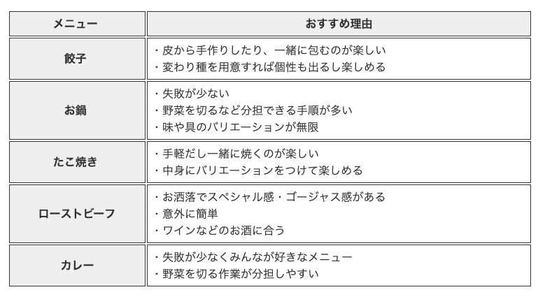 やはり「作業を分担しやすい」「簡単なもの」「一緒に作る過程を楽しめる」といった料理が多いようです。中には時間がたっぷりあるゴールデンウィークにしか出来ないような手の混んだ料理にチャレンジする、という回答もありました。