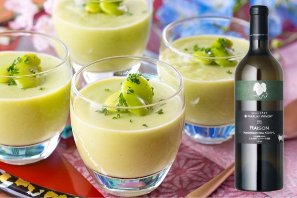 やや辛口の白ワイン「レゾン甲州2021」と一緒に、前菜代わりにお楽しみいただきたい一品が「そら豆の冷製すり流し」です。