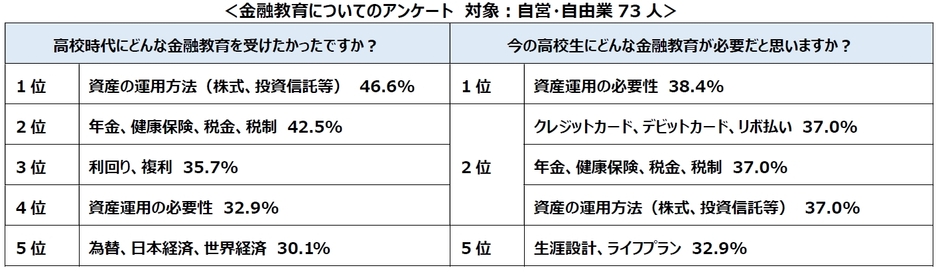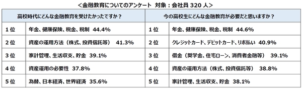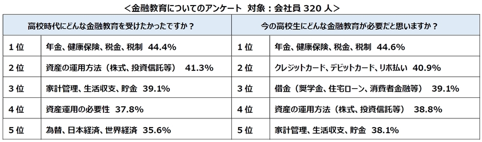 今回は、調査の対象800人中320人の回答があった会社員の方が、自分自身の高校時代に受けたかった金融教育と今の高校生に必要と思う金融教育に違いがないか上位5位を比較しました。