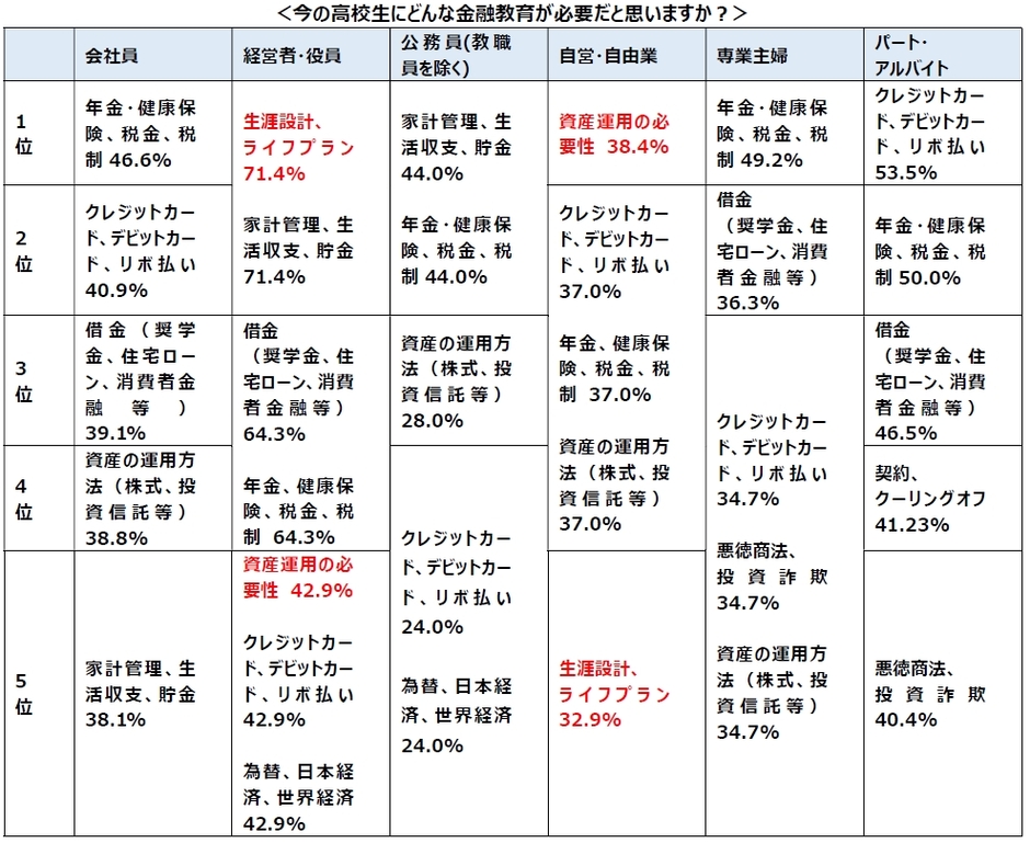 高校時代に受けたかった金融教育の項目は会社員とほぼ同じ内容となりましたが、今の高校生に必要な項目に関しては「資産運用の必要性」「生涯設計、ライフプラン」の項目が上位に入るという傾向が見られました。