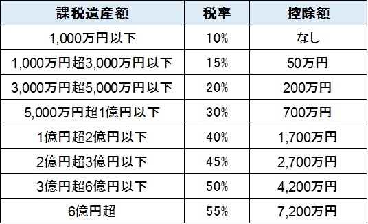 以下は、相続財産の取得金額に応じた税率と控除額の目安です(国税庁「No.4155 相続税の税率」)。実際の計算方法は、法定相続人(相続財産をもらう人)の人数や続柄によって異なり、複雑なのでここでは割愛します。