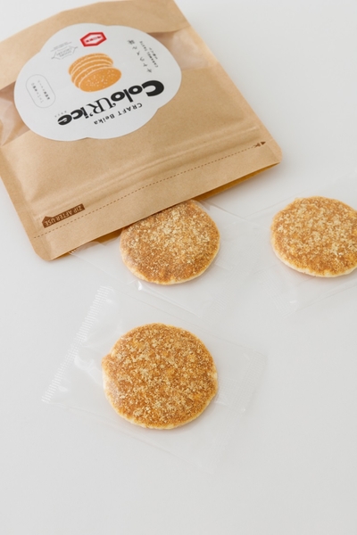焼洋菓子のような見た目と甘い味付けに、お米の風味と軽い食感で、余韻のあるおいしさを感じられる商品に仕上げました。また、パッケージにもこだわり、一見米菓には見えないかわいいデザインを採用し、“手作り感”をお届けするためにクラフト紙を用いた包材を使用しています。