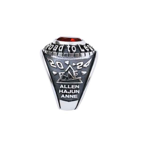 燻加工を施したシルバー925製のリングに、「BAE」のエンブレムや3人の名前、MCネームなどを取り込んだデザイン。中央にはチームのイメージカラーストーンをセットしました。
