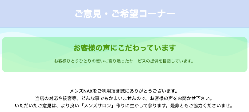 メンズ脱毛サロンNAXでは、お客様の声を大切にし、よりご満足いただけるサービスを提供するために「お客様意見箱」を設置しております。