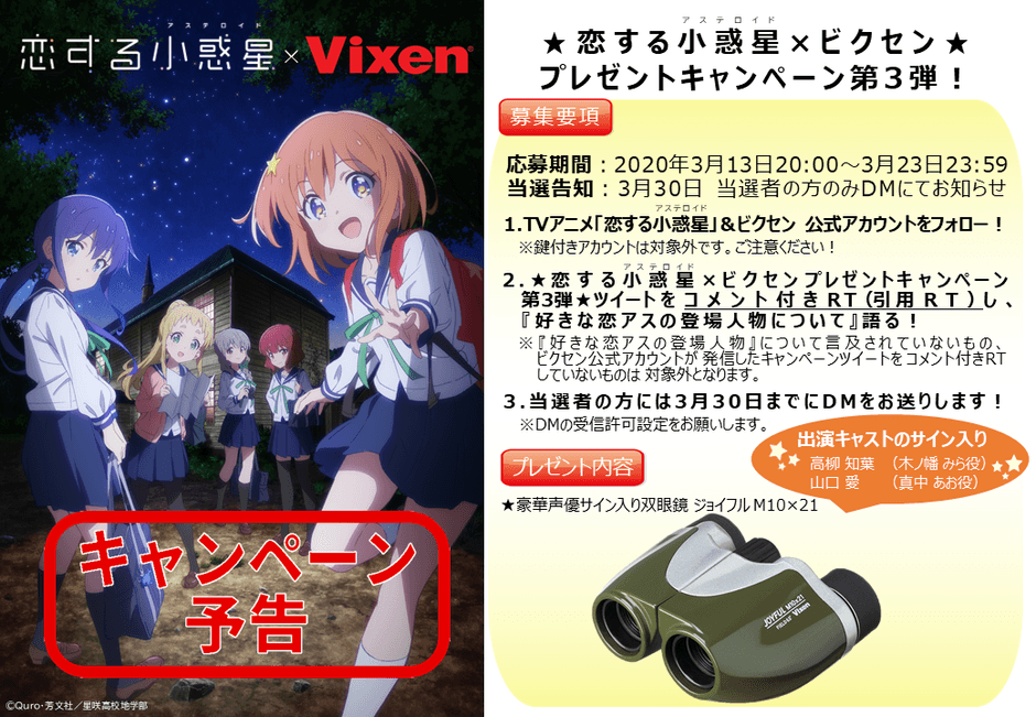この機会に、ぜひ、ビクセン公式ツイッター(@vixen_japan)と恋する小惑星公式ツイッター(@koiastv)をフォローの上、コラボキャンペーンにご応募ください。