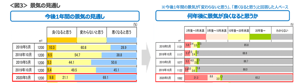 【景気の見通し】今後1年間の景気について、全体で69%が「悪くなると思う」と回答。「良くなると思う」という回答は10%で、先行きが見えない状況が現れる結果となった。また、景気が「変わらない・悪くなると思う」と回答した人に、何年後に景気が良くなると思うかを尋ねたところ、「わからない」が65%で最多で、次いで「2年後~5年未満」が21%、「5年後~10年未満」が9%となった。景気回復については依然として厳しい見通しの様子が窺える。<図3>