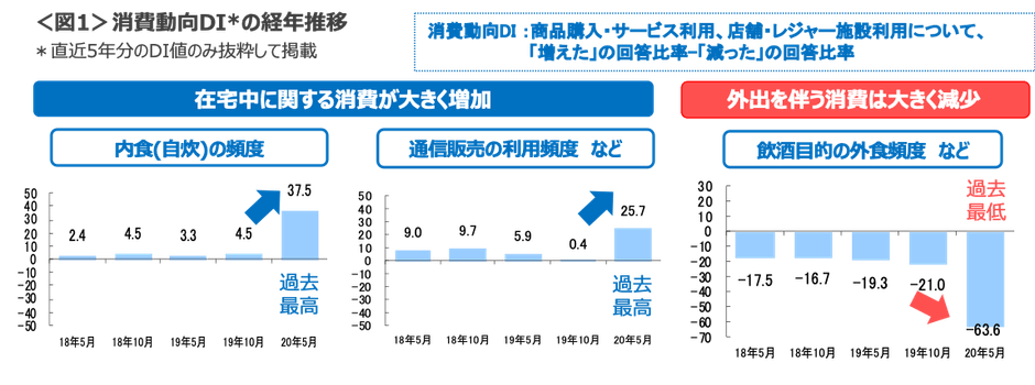 外出自粛・休業要請で明暗分かれた消費。 在宅関連の消費は過去最高、外出伴う消費は過去最低に。