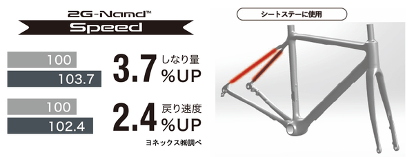 シートステーに新素材「2G-Namd™ Speed(ツージーエヌアムド スピード)※1」を採用し、静止時は通常カーボンと同等の剛性ながら、走行時はしなり量が増加し、しなり戻り速度がアップすることで、ペダリングのパワーを効率良く推進力に変えます。