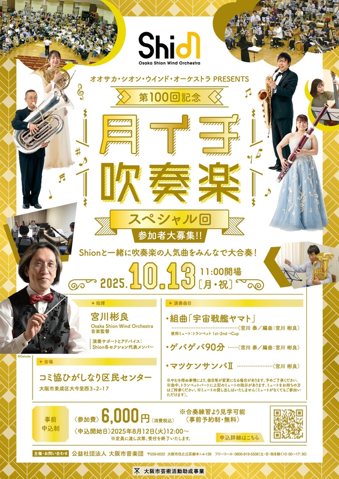 日本で最も長い歴史と伝統を誇る交響吹奏楽団のOsaka Shion Wind Orchestraを有する公益社団法人 大阪市音楽団(本社:大阪市住之江区/理事長:石井徹哉)は、月に一度、楽器を持っている方が集まって、Shionメンバーと一緒に吹奏楽曲を演奏できる人気イベント「月イチ吹奏楽」の第100回記念公演を2025年10月13日(月・祝)に開催します。
