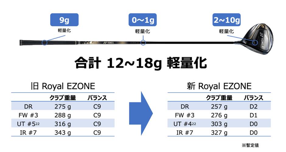 すべてのクラブにおいて、クラブ全体で12gから18gの軽量化に成功し、Royal EZONE史上最軽量を更新。振りやすさが向上したことで、より高く、真っ直ぐにやさしく飛ばすことができます。