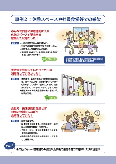 本事例集は、東北大学病院 感染管理室の監修のもと、11月27日に厚生労働省が公表した「新型コロナウイルス感染症(COVID-19)に係る職場における集団感染事例」と市内での発生状況を基に、職場内で集団感染が発生した原因として考えられることとその対策を、イラストを用いて4つの事例を挙げて分かりやすく解説している。
